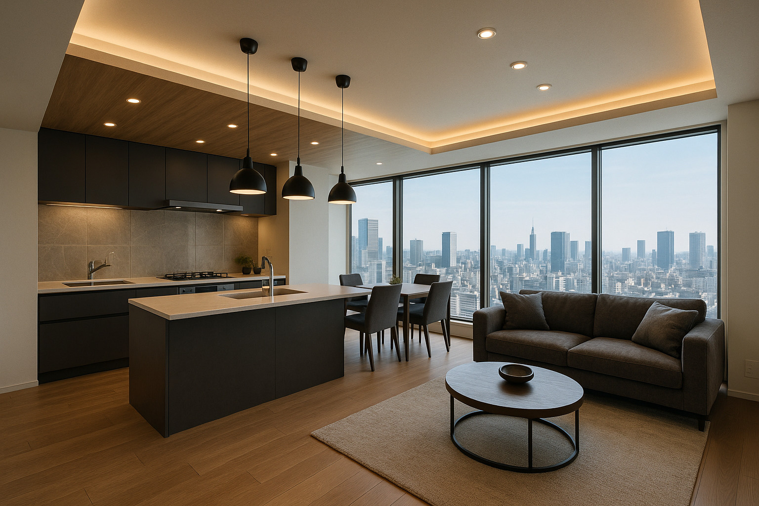 角住戸率が高いため、その角住戸の大きな開口部や眺望を活かしキッチンを壁に寄せずLDK中央に置くアイランドが相性良い。