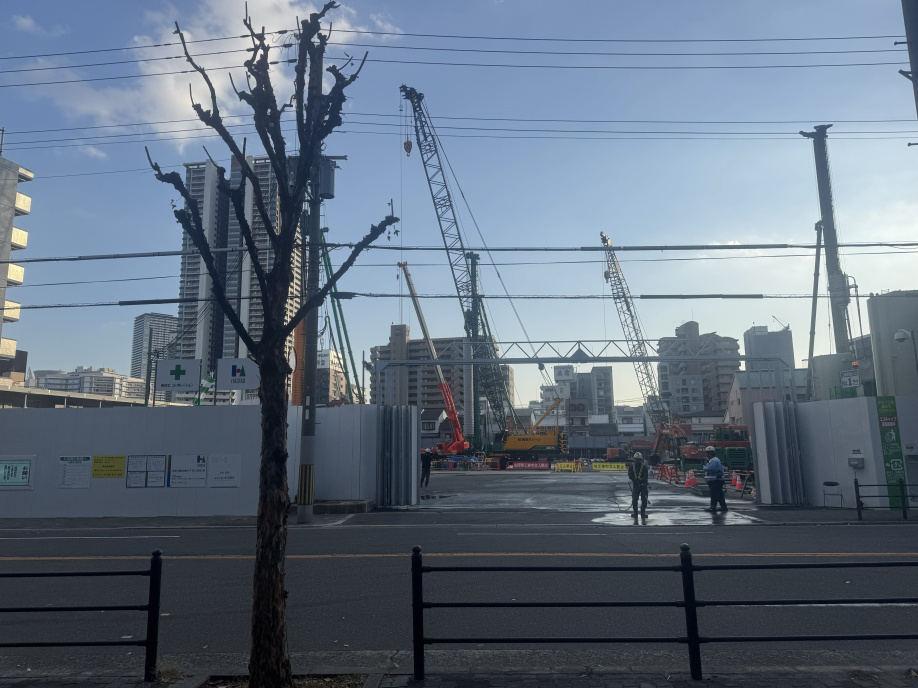 写真の通り、敷地内には大型クレーンが複数台入り、杭工事・基礎工事の工程が本格化しています。