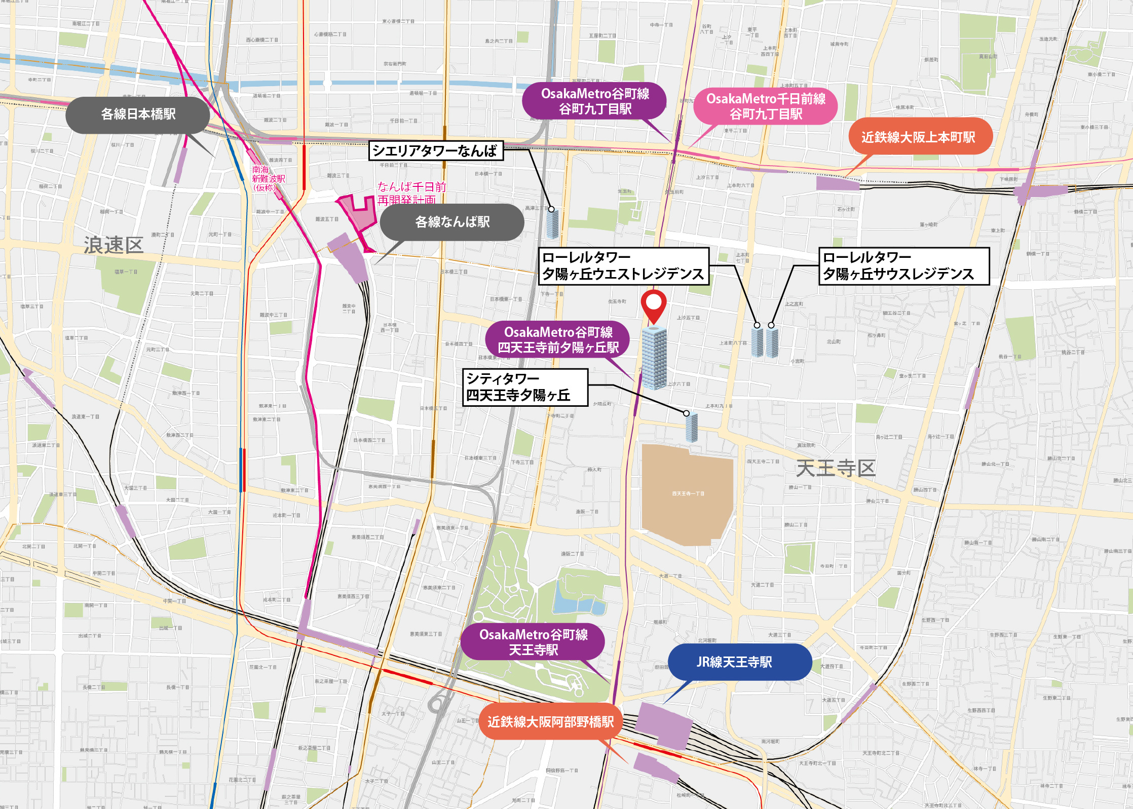 交通: 梅田、天王寺、東梅田へ直結する谷町線「四天王寺前夕陽ヶ丘」駅までフラットアクセス。
