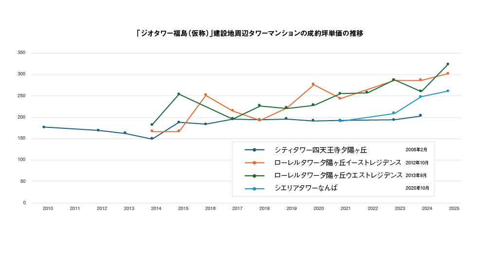 今回は、客観的なデータとして「建設地周辺の既存タワーマンションの中古成約単価の推移」を見ながら、